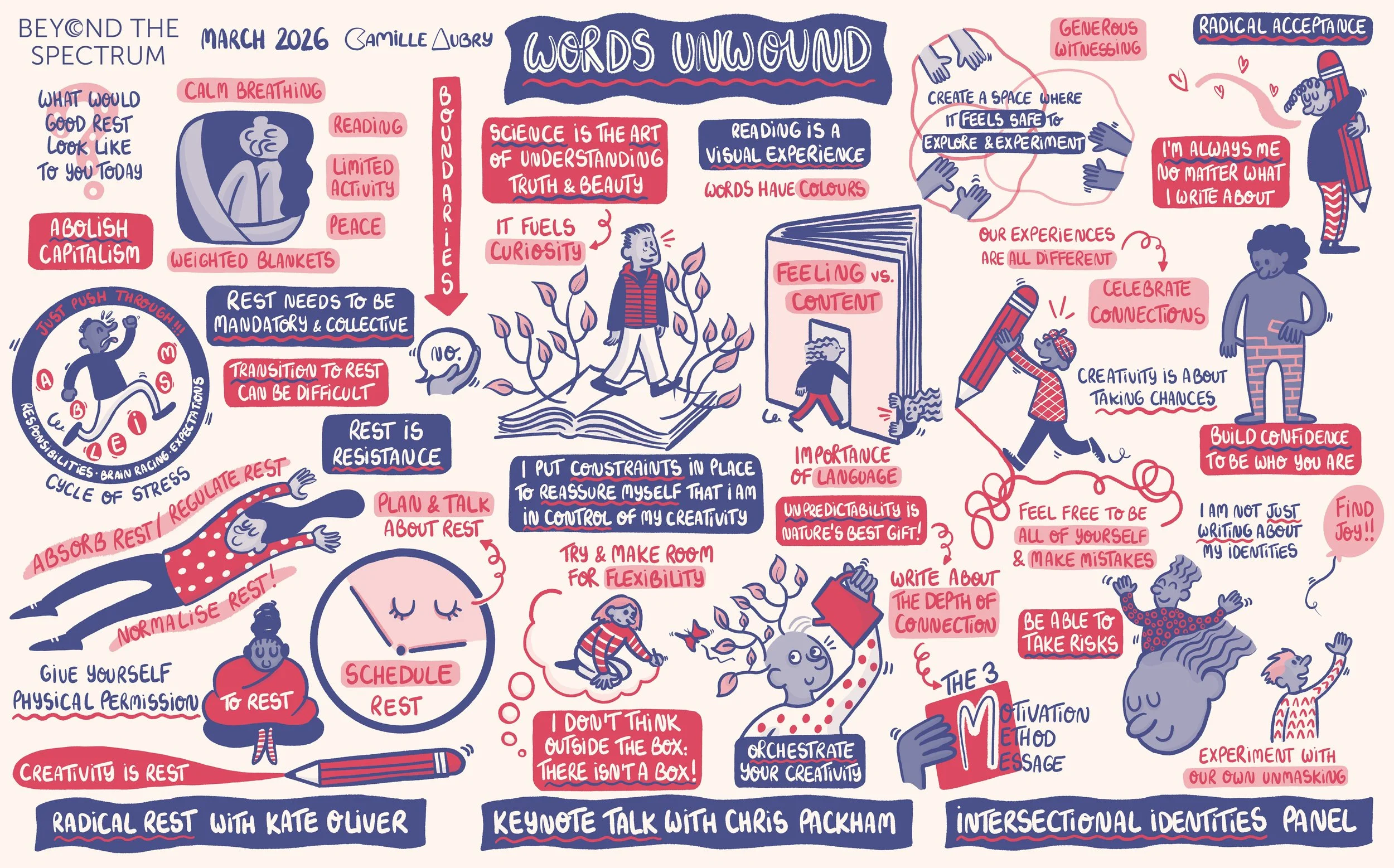 This year’s edition, Words Unwound, focused on the importance of slowing down, reflecting and creating our authentic voice. It celebrated rest as a source of creativity and connection. Calling for radical acceptance, the festival explored the opportunities to find joy and build confidence as autistic writers, which is jey within our ableist society, often driving us to burnout through an endless cycle of stress. Finding space for rest and normalising it enables creativity and the ability to take risks.